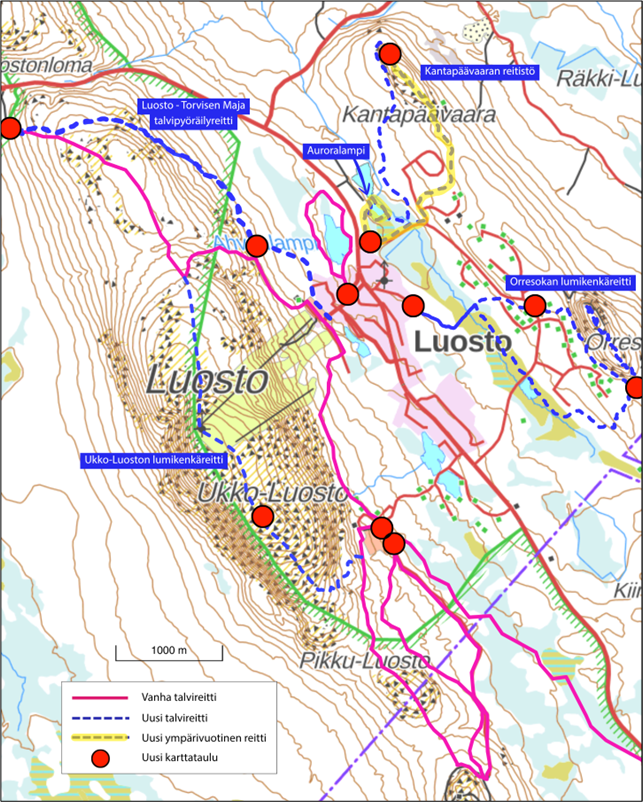 Sodankylän investointihankkeessa rakennettiin Luostolle kaksi täysin uutta, ympärivuotiseen käyttöön soveltuvaa reittiä: 1,2 kilometrin mittainen Auroralammen reitti ja 2,5 kilometriä pitkä reitti Kantapäävaaraan. Lisäksi tehtiin uudet lumikenkäreitit Ukko-Luostolle, Orresokalle ja Kantapäävaaran alueelle. Luostolta Torvisen Majalle kulkevan alareitin linjausta puolestaan muutettiin niin, että se soveltuu nyt myös talvipyöräilyyn.